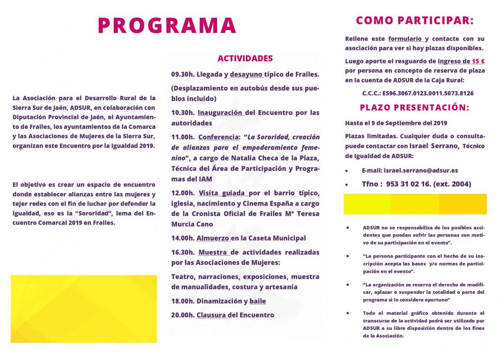 El GDR Sierra Sur de Jaén, ADSUR, en colaboración con Diputación Provincial de Jaén, el Ayuntamiento de Frailes, los ayuntamientos de la comarca y las Asociaciones de Mujeres de la Sierra Sur, organizan este Encuentro Comarcal por la Igualdad 2019.