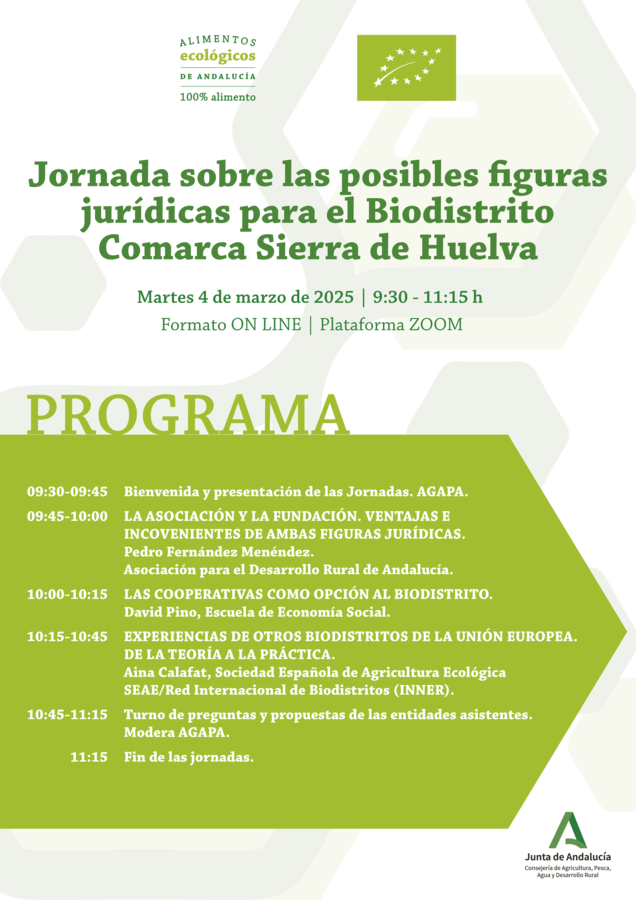 El segundo evento sobre las posibles figuras jurídicas para el Biodistrito Comarca Sierra de Huelva será el 4 de marzo de 09:30-11:15 h, también en formato online. En estas jornadas se expondrán las principales figuras jurídicas que pueden representar al Biodistrito: las asociaciones, las fundaciones y las cooperativas, para que el partenariado que viene participando en las reuniones de trabajo conozca las opciones y valore cuál encajaría más en el modelo de trabajo que se está creando en la sierra. Tendremos además la oportunidad de conocer cuáles son las que están funcionando en otras zonas de la Unión Europea con biodistritos consolidados. Una vez acabadas las exposiciones, podremos conversar con las personas ponentes.