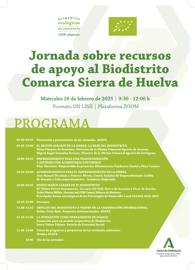 La Agencia de Gestión Agraria y Pesquera de la Junta de Andalucía (AGAPA) te ofrece la oportunidad de asistir, totalmente gratis, a dos sesiones online sobre recursos y posibles jurídicas para el Biodistrito de la Comarca Sierra de Huelva