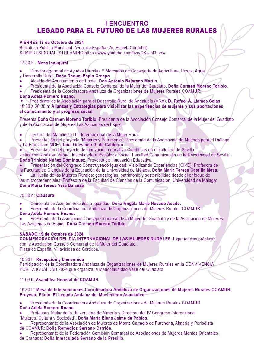 Con motivo del Día internacional de las Mujeres Rurales, la Coordinadora Andaluza de Organizaciones de Mujeres Rurales (COAMUR) en colaboración con el Consejo Comarcal de Mujeres del Valle del Guadiato en Córdoba organizan el I Encuentro Legado para el futuro de las mujeres rurales. El evento tendrá lugar los días 18 y 19 de octubre de 2024 en Espiel y Villaviciosa de Córdoba. También podrá seguirse vía streaming en el canal Youtube de COAMUR.