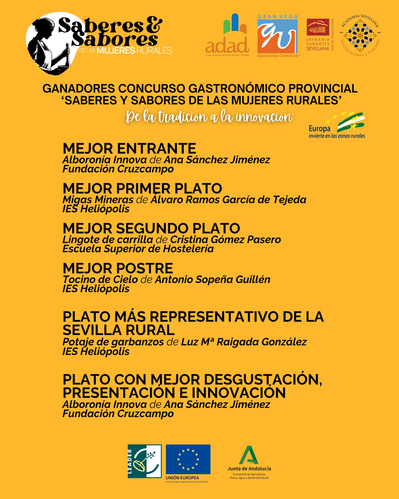 ‘Saberes y sabores de las mujeres rurales’ es un proyecto enmarcado en la línea de cooperación del programa LEADER que cofinancia en un 90% el FEADER de la Unión Europea y en un 10% la Consejería de Agricultura, Pesca, Agua y Desarrollo Rural de la Junta de Andalucía, y que ha contado con la colaboración de la Academia Sevillana de Gastronomía y Turismo, las tres Escuelas de Hostelería sevillanas, Ayuntamientos y multitud de asociaciones de mujeres y entidades sociales de los tres territorios rurales.