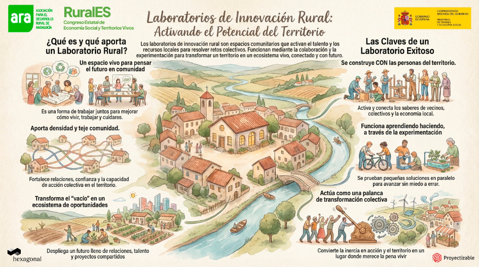 La Universidad de Córdoba acogió RuralES, el I Congreso Estatal de Economía Social y Territorios Vivos, impulsado por la Asociación para el Desarrollo Rural de Andalucía (ARA), con la colaboración de Hexagonal y Proyectizable, financiado por el Ministerio de Trabajo y Economía Social. Un encuentro que reunió a un centenar de representantes de Grupos de Desarrollo Rural, administraciones públicas, entidades sociales, proyectos innovadores y agentes del territorio de distintas comunidades autónomas para compartir experiencias, construir alianzas y pensar las condiciones que hacen posible y sostenible la vida en los pueblos.