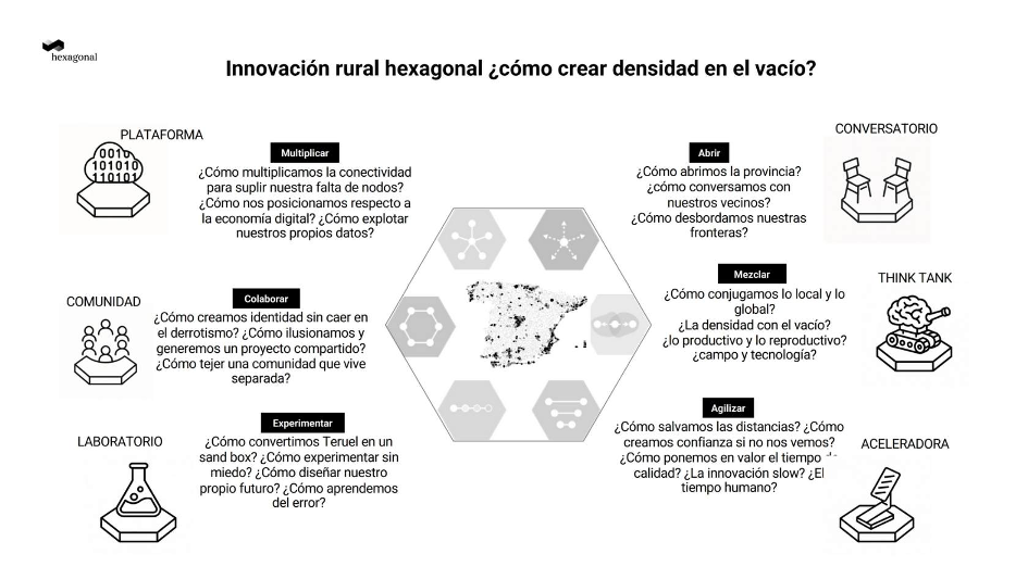 En el núcleo de su intervención, Oliván condensó 25 años de experiencia de trabajo en una idea operativa: la densidad relacional se construye mediante los seis vectores del Modelo de Innovación Hexagonal: abrir, mezclar, agilizar, experimentar, colaborar y multiplicar. Esos vectores funcionan para unir personas, ideas, territorios, recursos y organizaciones. Al aplicarlos a través de un conjunto de mecanismos y metodologías podemos “crear densidad donde parece predominar el vacío”.